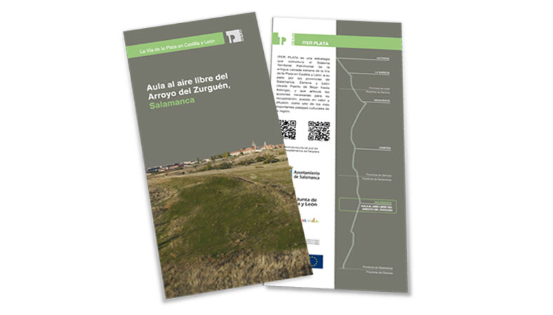 Folleto informativo en el que se ofrece planimetría sobre el tramo de la Vía de la Plata que discurre junto al Arroyo del Zurguén, así como información sobre los elementos de interés arqueológico que se encuentran en su recorrido.