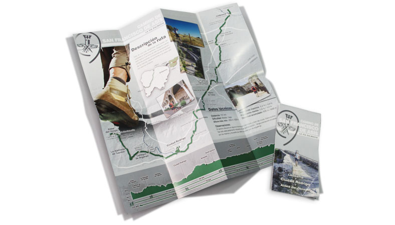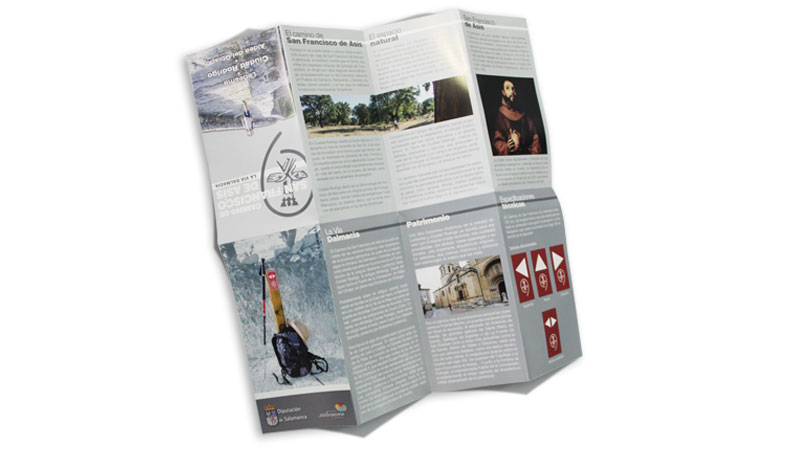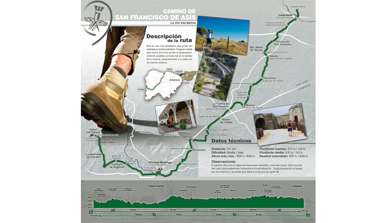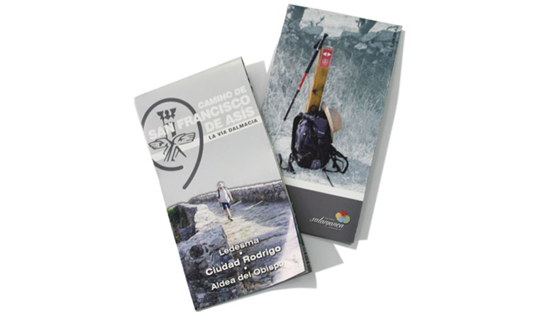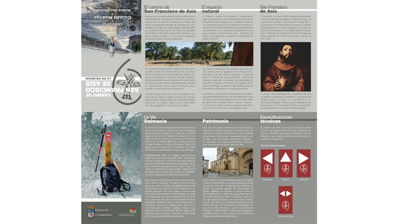 Folleto promocional del Camino de San Francisco de Asís (Vía Dalmatia), que une a través de un camino peatonal de doble sentido, el Fuerte de la Concepción en Aldea del Obispo y el Puente Mocho de Ledesma, aportando datos técnicos, información sobre el camino recorrido por el santo, el espacio natural, patrimonio existente a lo largo de la ruta, la figura de San Francisco de Asís o sobre la Vía Dalmacia.