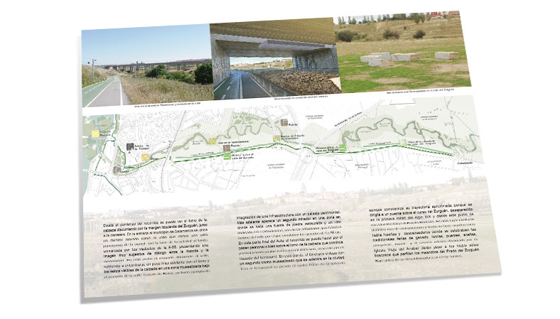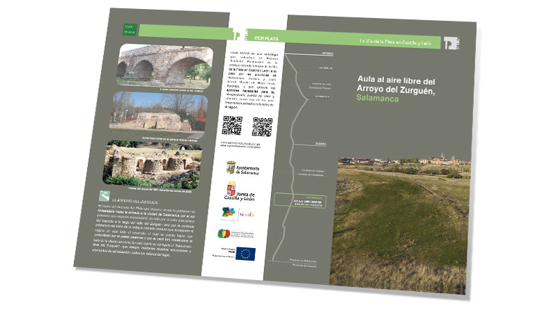 Folleto informativo en el que se ofrece planimetría sobre el tramo de la Vía de la Plata que discurre junto al Arroyo del Zurguén, así como información sobre los elementos de interés arqueológico que se encuentran en su recorrido.