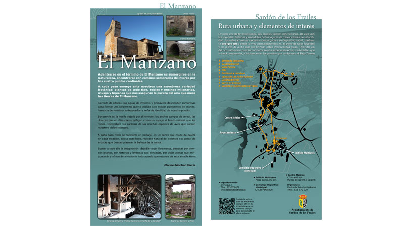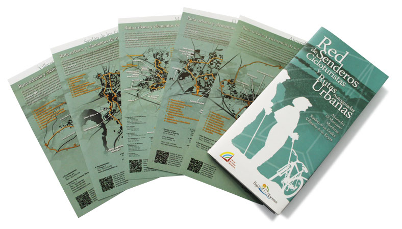 Díptico-carpetilla en el que se recoge la información general de la Red de Senderos Cicloturistas, albergando en su interior 5 flyers en los que se aporta información al visitante sobre la ruta autoguiada urbana de cada pueblo.