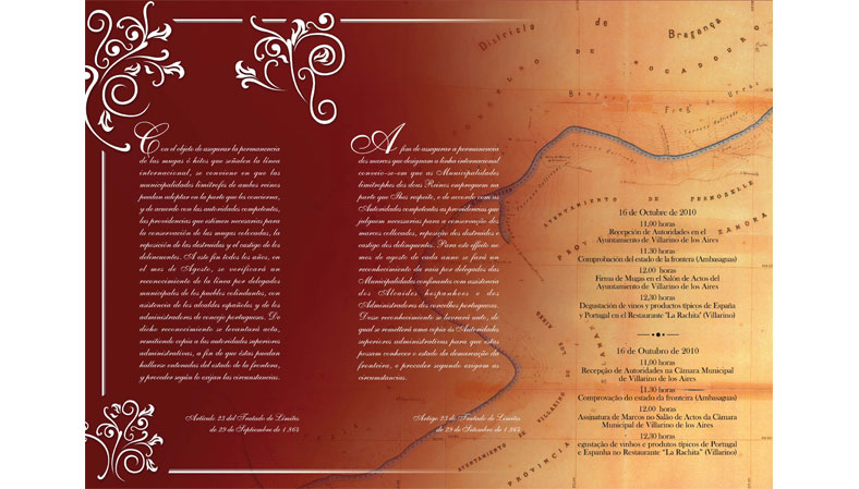 Folleto bilingüe (español y portugués) informativo sobre los actos realizados el 16 de octubre del año 2010 en relación al Tratado de la firma de las Mugas, así como información histórica sobre dicho Tratado.
