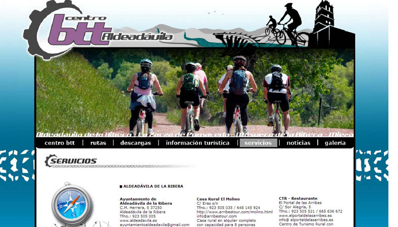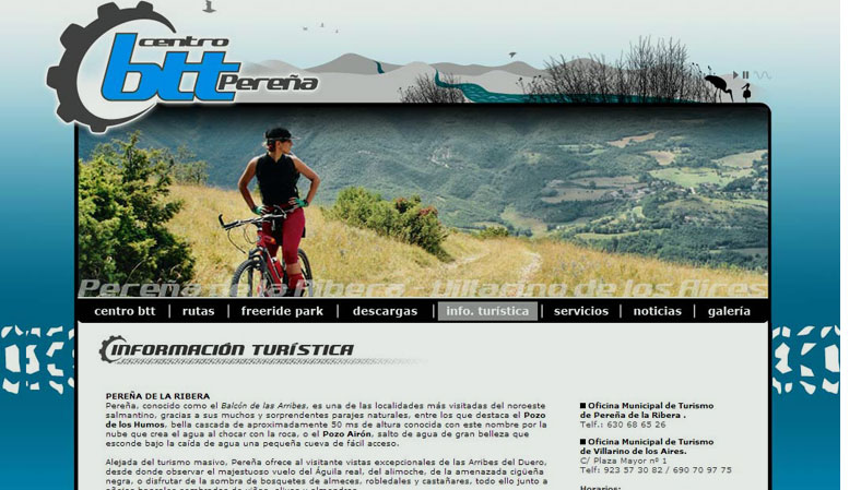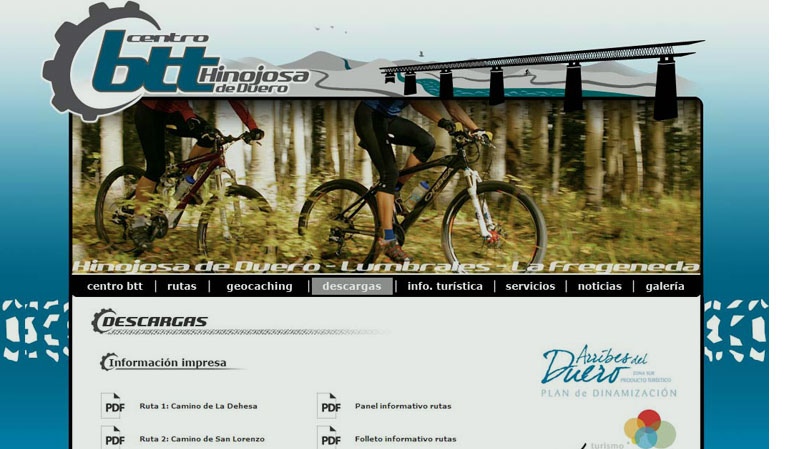 Diseño de las páginas web promocionales e informativas de diferentes Centros BTT de la región de Arribes del Duero, en los que se incluyen información técnica, turística, recorridos, tracks descargables, etc. El diseño gráfico común a todas ellas responde a la búsqueda de promoción conjunta.
