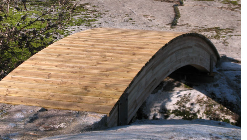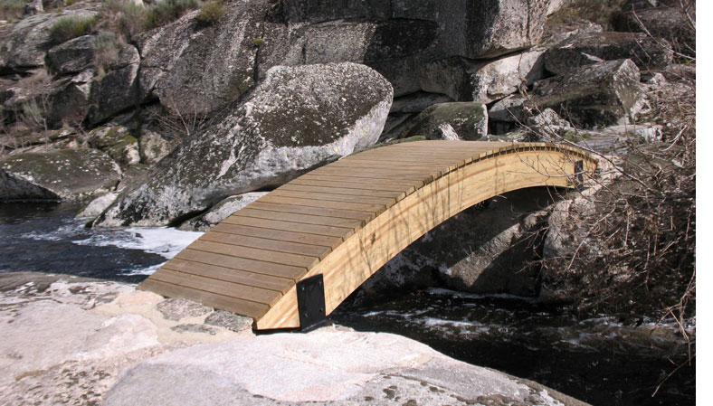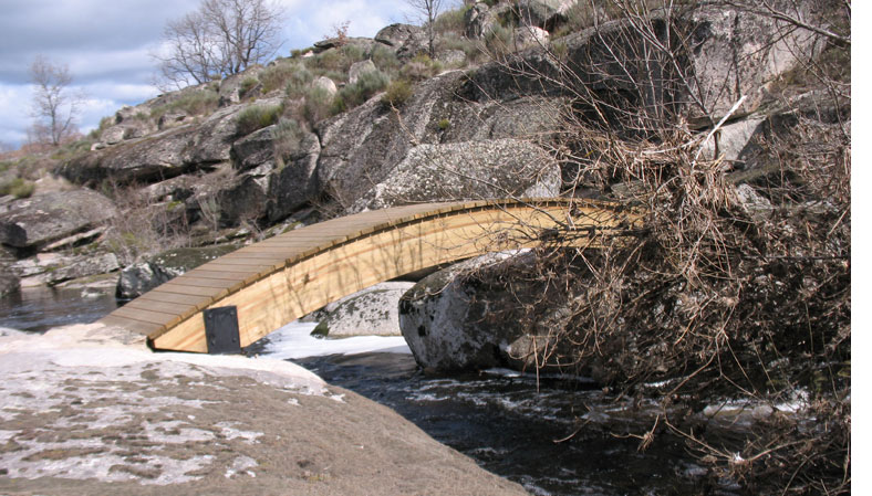 Con el nombre de La Puente Palo se conocía un paso sobre el Uces fabricado en madera que, cada vez que creía el Uces, era arrastrado por su corriente torrencial Para solventar este problema, hemos construido un puente de madera con vigas curvas ancladas a la propia roca. A las semanas de su instalación el Uces, en una de sus crecidas, fue incapaz de moverlo.