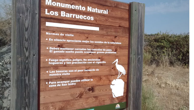 Señalización indicativa en el Monumento Nacional Los Barruecos.